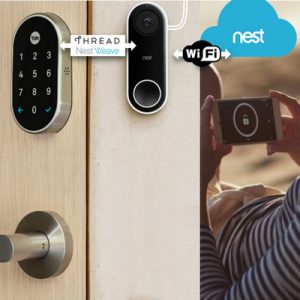 August and Nest/Yale employ low-energy home-automation protocols (Bluetooth LE and Thread/Weave) for their door locks, connecting to the home network via Wi-Fi-enabled video doorbells powered over wire.